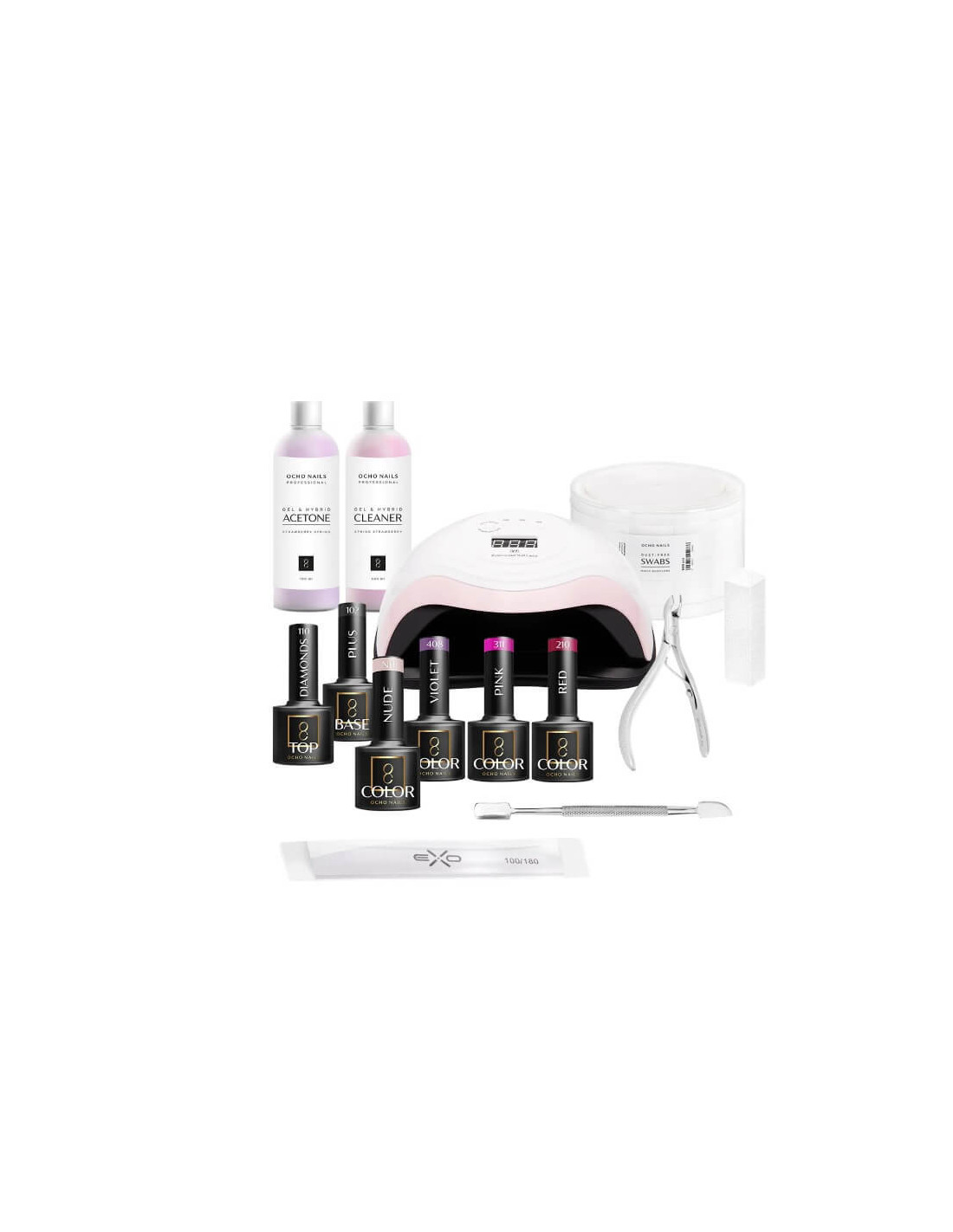 1. Ce include kitul Ocho Hybrid Start 1? Kitul conține 13 piese esențiale: lampă UV/LED, cleanser, acetonă, pilă, clește pentru cuticule, spatulă, tampoane, bază, top coat și 4 nuanțe de ojă semipermanentă.