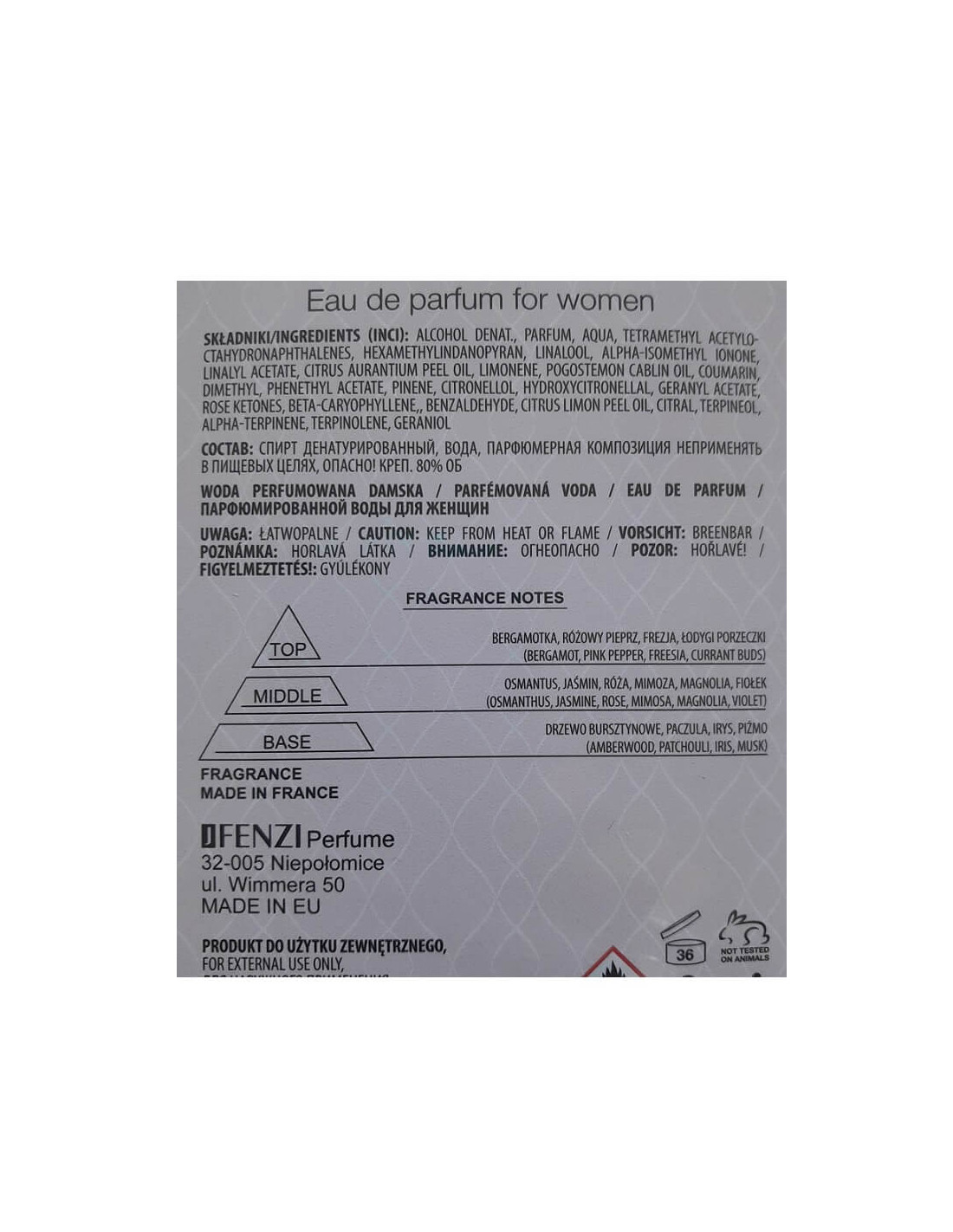 C'est la vie bouquet de la Jfenzi este o apă de parfum floral-fructată, creată pentru femeile care apreciază eleganța subtilă și rafinamentul olfactiv. Inspirată de aroma iconică. Aceasta formula poloneză oferă o experiență senzorială delicată, dar memorabilă. Ideală pentru saloane de înfrumusețare și clientele care caută parfumuri originale pentru femei la prețuri avantajoase.