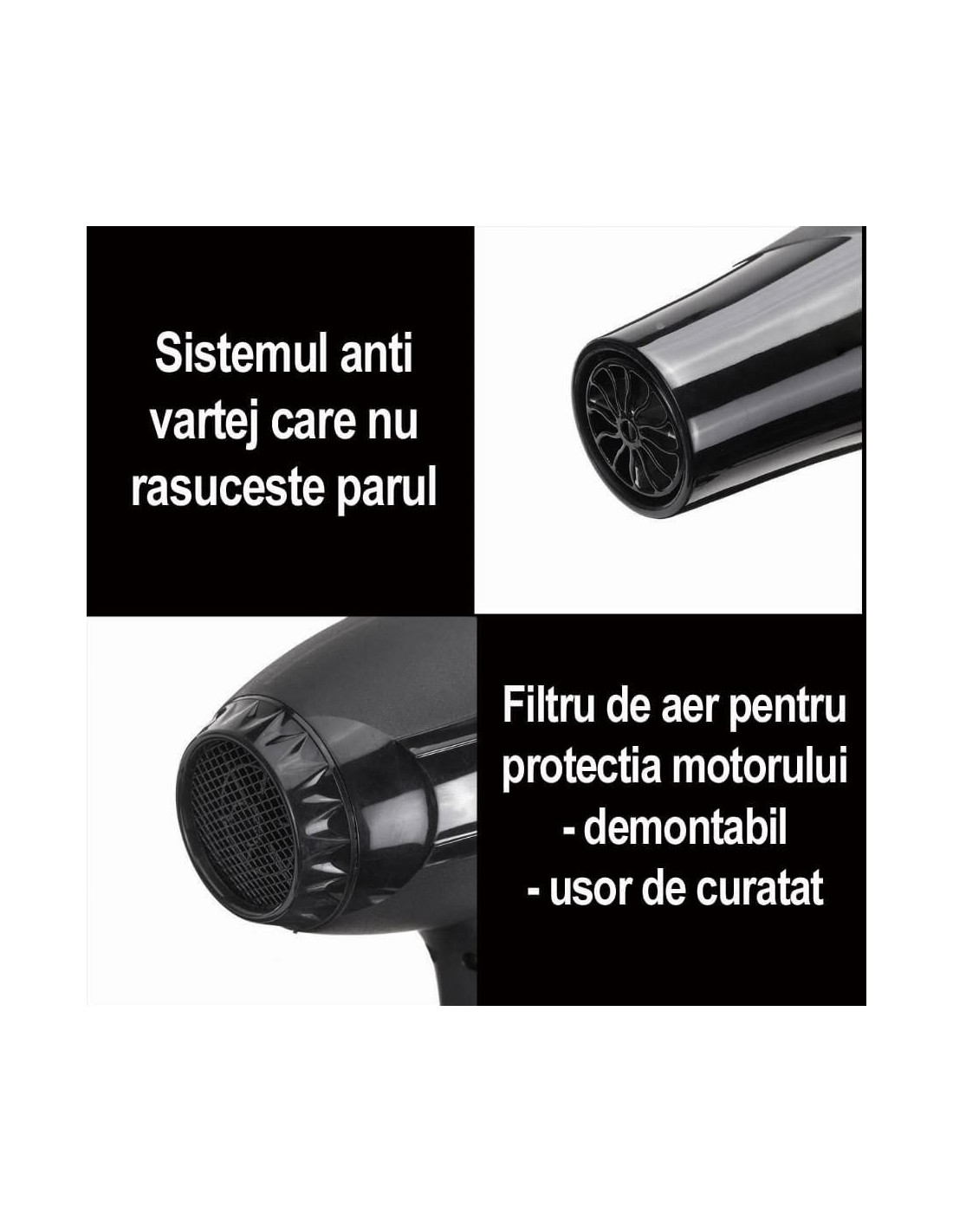 Funcții: ceramică, turmalină, filtru dorsal detasabil